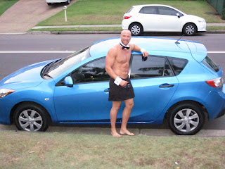 This is Pete from "Butlers in the Buff" looking very buff indeed and posing with my new car. I was at my Bff's handbag party that she was hosting. As an added benefit she hired young Pete to serve us drinks, food and anything else we needed (within reason). So I asked him to pose with my car as I am so in love with it. In fact he was the first male to get into the backseat of my car. Now don't get any ideas I was driving him up to the local bottlo, he was such a good sport that he went dressed or undressed as you see him below with butt hanging out in all his glory! The man has no shame. I did feel sorry for the old bloke standing behind him in line at the counter. Poor bugger didn't know where to look. All of a sudden the ceiling held so much appeal for him. LOL! Didn't help matters when I gave Pete a little smack on his butt cheek to make the old bloke look down. Oh naughty Princess, but it was so funny!